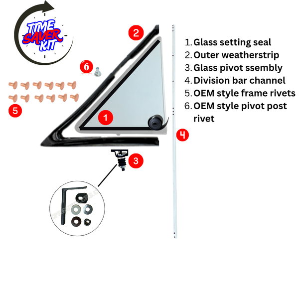 - (12) Vent window frame rivets (Factory OEM style hollow-body rivets)