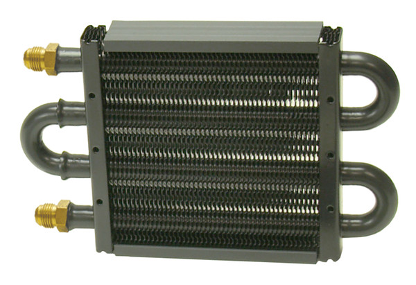 This little 4 pass fluid copper/aluminum cooler features -6AN fittings, extruded plastic fin edge guards and a black powdercoat finish for long lasting durability. It is ideal for fuel or power steering cooling as well as auxiliary transmission cooling.