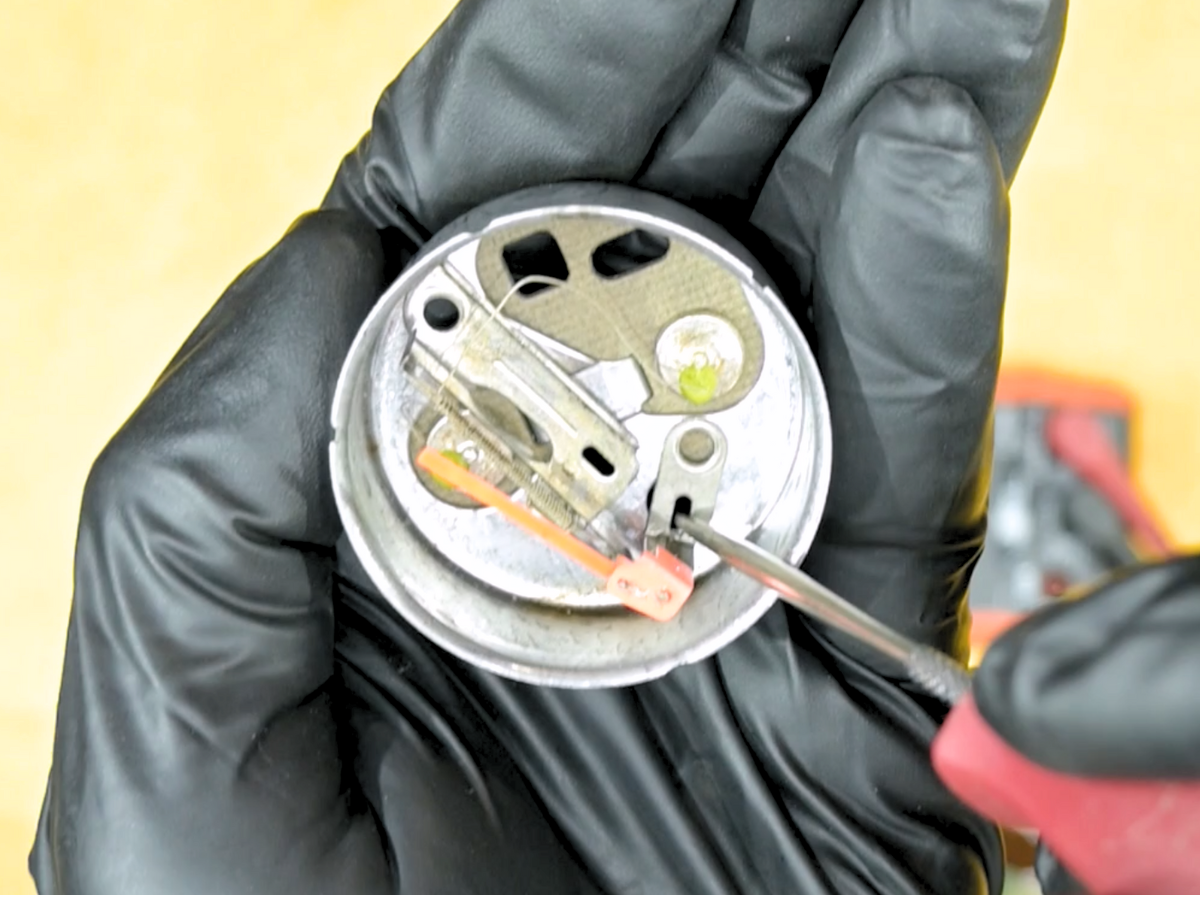 You’ll need a steady 12 V power source (battery or power supply), a Power Probe (or simple leads) for power/ground, a small potentiometer as your adjustable sender stand-in, and a multimeter set to resistance (Ω). For the face, a 90° pick and a tiny micro pry tool let you work around the crimp slowly; a flat tool helps flatten any small kinks. A tiny dab of dielectric grease after cleanup can help keep moisture away from the windings.