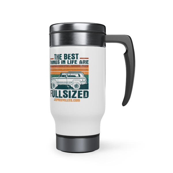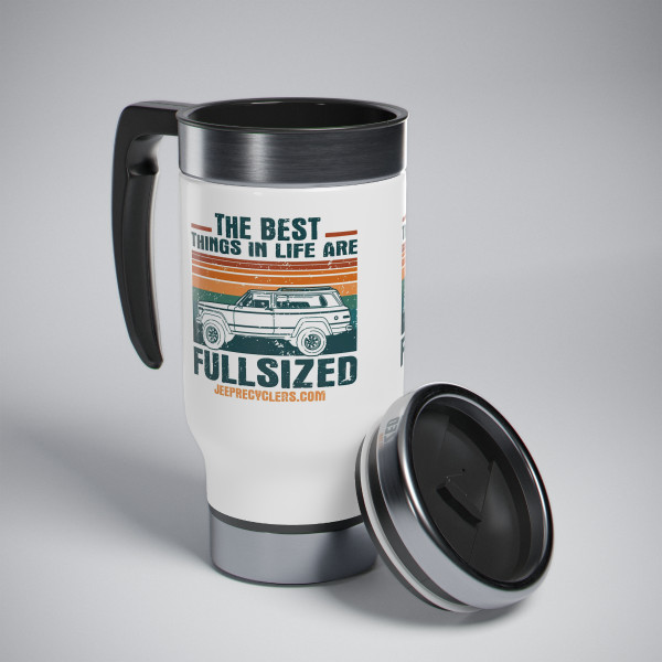 Enjoy your adventures with our "Cherokee Best Things in Life Full-Sized" Travel Mug, the perfect Jeep lover's companion. This 14 oz. travel mug, made from durable stainless steel, maintains your drink's temperature for hours. Featuring an easy-to-clean lid and an iconic Jeep and mountain design, it's built for the road, wherever it may take you. Embrace the thrill of the journey with every sip.