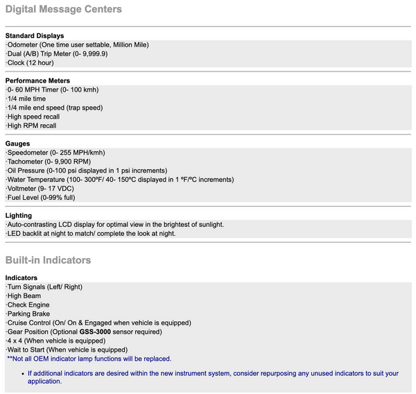 A few of the features which you don’t normally see are the micro-controlled precision stepper motors, solid state sensors for unparalleled accuracy, and user-customizable display feedback, all supported by an unrivaled limited lifetime warranty which has become the standard for Dakota Digital instrumentation systems .