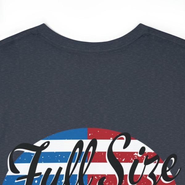 The T-shirt prominently features a lively, modern design that incorporates a detailed graphic of a classic Cherokee Jeep with the compelling "Full Size Freedom" typography. The artwork catches the eye on the front of the T-shirt, adding a dose of nationalistic energy to the solid color backdrop.