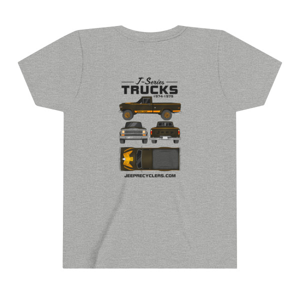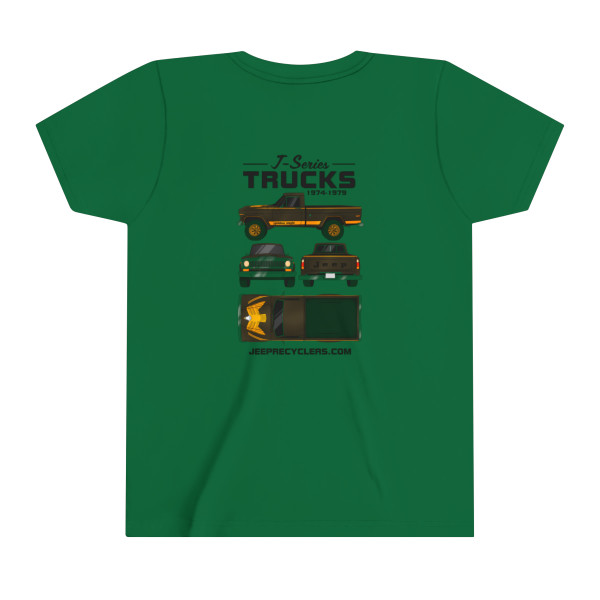 Introduce the young ones to the world of classic automotive design with our kids' short sleeve shirt, featuring the legendary Jeep Golden Eagle from the J-Series era, 1974 to 1979. Made with 100% Airlume combed and ring-spun cotton, this shirt ensures a gentle touch against their delicate skin. The vibrant design coupled with premium fabric creates the perfect blend of comfort and style, making it an instant favorite in their wardrobe.