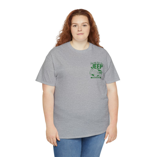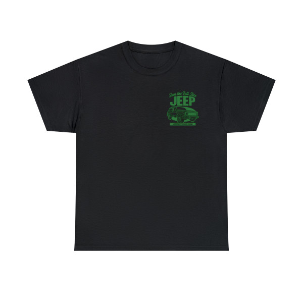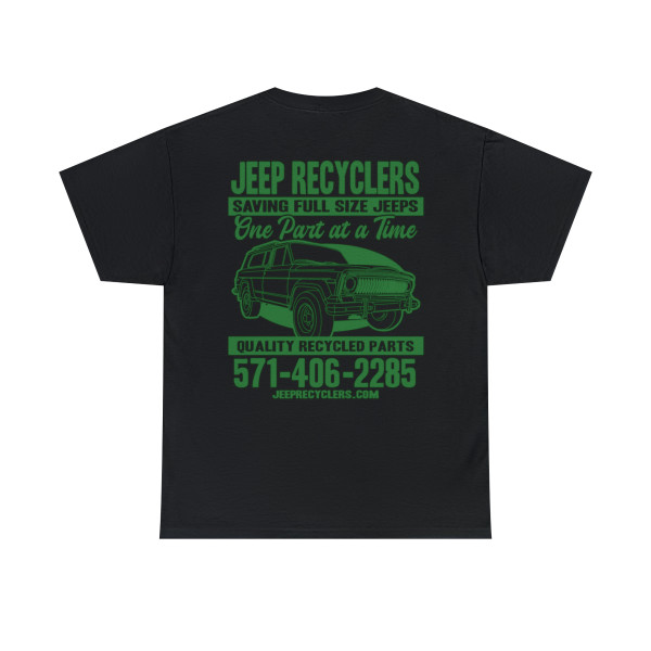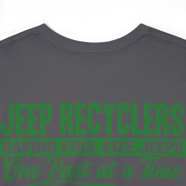 The shirt features the proudly displayed JeepRecyclers logo on the front, and the back showcases a detailed, eye-catching image of the classic Cherokee SJ. This iconic Jeep model, loved by many, is celebrated in all its glory, reflecting our commitment to the classic Jeep heritage.