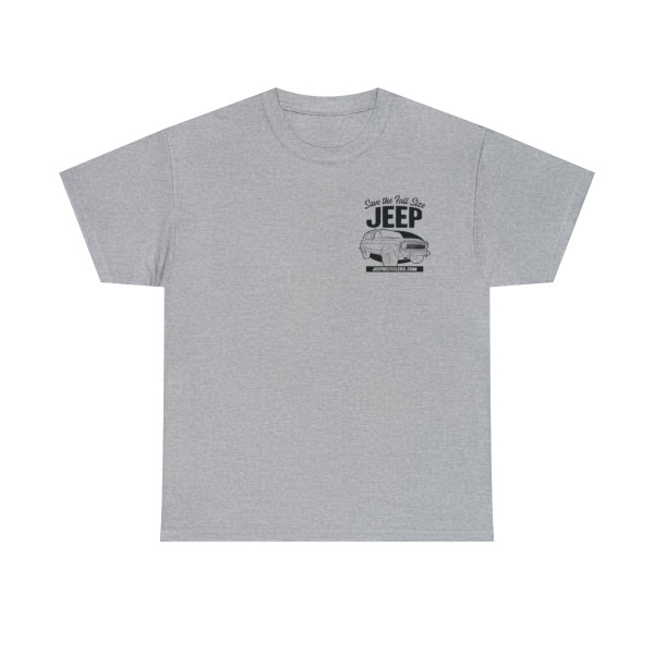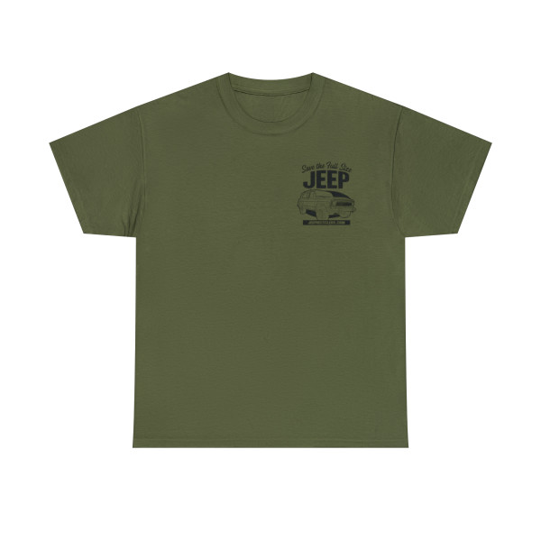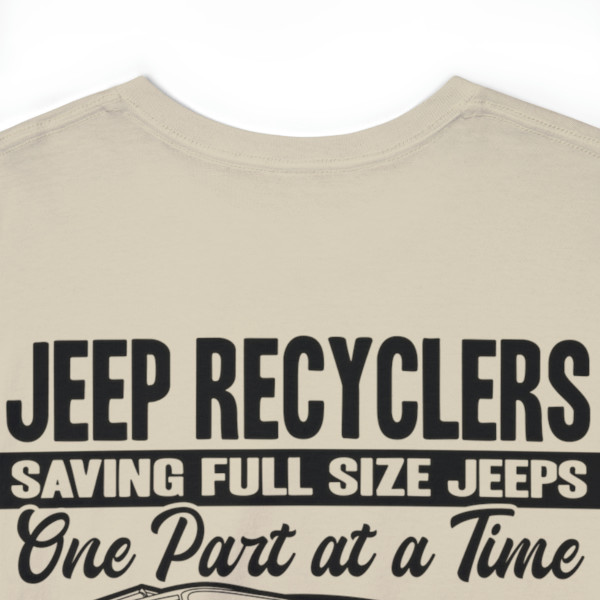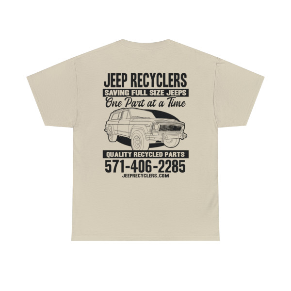 The shirt features the proudly displayed JeepRecyclers logo on the front, and the back showcases a detailed, eye-catching image of the classic Cherokee SJ. This iconic Jeep model, loved by many, is celebrated in all its glory, reflecting our commitment to the classic Jeep heritage.