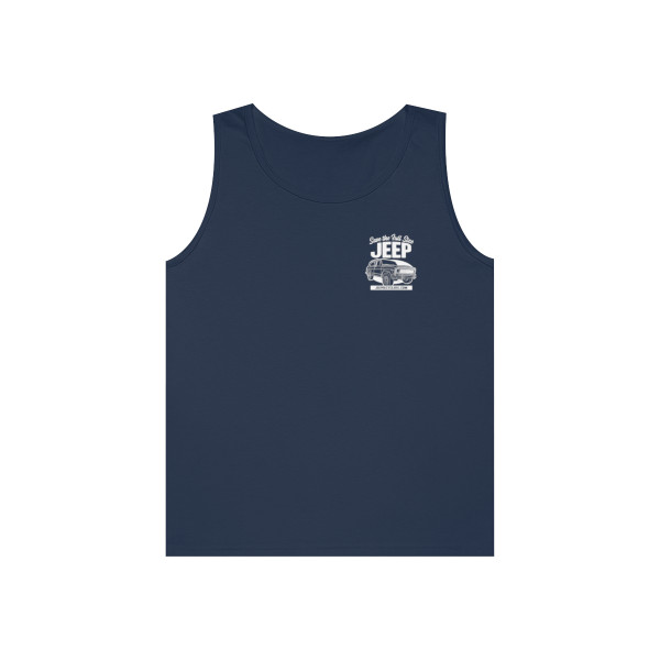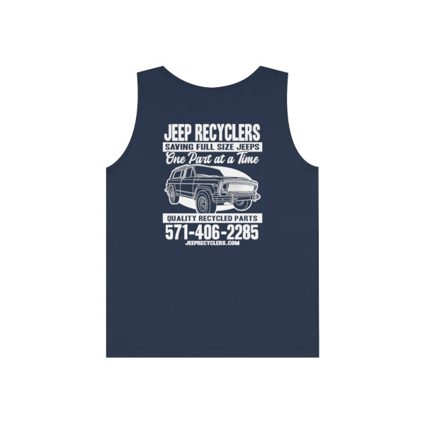 The tank top features the proudly displayed JeepRecyclers logo on the front, and the back showcases a detailed, eye-catching image of the classic Cherokee SJ. This iconic Jeep model, adored by many, is celebrated in all its glory, reflecting our commitment to the classic Jeep heritage.