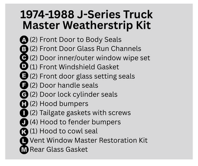 Sale quick view Choose Options 1974-1988 J-Series Truck Master Weatherstrip & Vent Window Restoration Kit (1) MSRP: $896.00 $650.00 Master Weatherstrip & Vent Window Restoration Kit for 74-88 J-Series Trucks If your goal is to replace every single weatherstripping seal on your J-Truck—or you’re diving into a full frame-off restoration—this all-in-one Master... Choose Options Add to Wish List Add to My Wish List Create New Wish List Compare