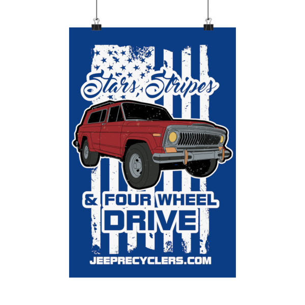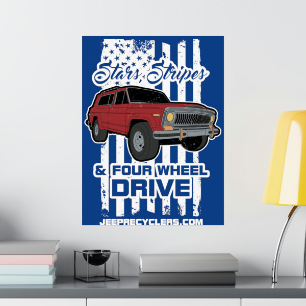 Transform your child's space into an adventurous haven with our Stars, Stripes & 4WD Red Cherokee SJ Kids Wall Art Poster. Printed on 175 gsm fine art paper, this wall art ensures quality and longevity. It's available in multiple sizes to cater to various wall spaces. The matte finish offers a sleek, modern touch, and the design captures the timeless American spirit with its depiction of stars, stripes, and the iconic Full Size Jeep Cherokee SJ 4-wheel drive. Intended for indoor use, this poster is the perfect way to express passion and admiration for the legendary Jeep. Please note, due to the production process, there might be slight size deviations with a tolerance +/- 1/16".